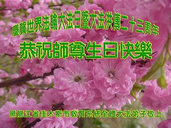 黑龙江省佳木斯市教育系统全体大法弟子恭贺世界法轮大法日暨师尊华诞!庆贺世界法轮大法日暨大法洪传二十三周年!恭祝师尊生日快乐!