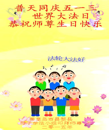 师父您辛苦了! 弟子一定听从师父的教诲,跟上正法進程,修炼如初,做好三件事,不负众生所望。 弟子跪拜师恩! 河北省青龙县一学法小组 2015年5月5日 河北秦皇岛一学法小组恭祝慈悲伟大的师尊生日快乐!
