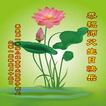 在师尊生日来临之际,我们两个学法小组的全体大法弟子跪拜谢师恩:师尊辛苦了!谢谢师尊的慈悲苦度!同时恭祝师尊生日快乐!同庆5.13世界法轮大法日! 重庆一大法弟子代母亲、姐姐、妹妹同修一起恭祝慈悲伟大的师尊生日快乐! 缘份使我们一家四人得法,师恩让我们报答不尽。唯有共同精進,做好三件事才是献给师尊最好的礼物。 千言万语汇成一句话:恭祝师尊生日快乐!同祝5.13世界法轮大法日! 重庆四位大法弟子代表四代同堂的全家人庆祝大法洪传二十三周年暨慈悲伟大的师父华诞!