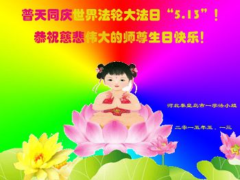 普天同庆世界法轮大法日“5.13”! 听师父的话,走好走正助师正法的路。 河北秦皇岛一学法小组敬上 2015年5月6日 恭祝慈悲伟大的师尊生日快乐! 普天同庆世界法轮大法日“5.13”! 听师父的话,走好走正助师正法的路。 河北秦皇岛一学法小组敬上 2015年5月6日 河北省秦皇岛大法弟子恭祝师尊生日快乐!