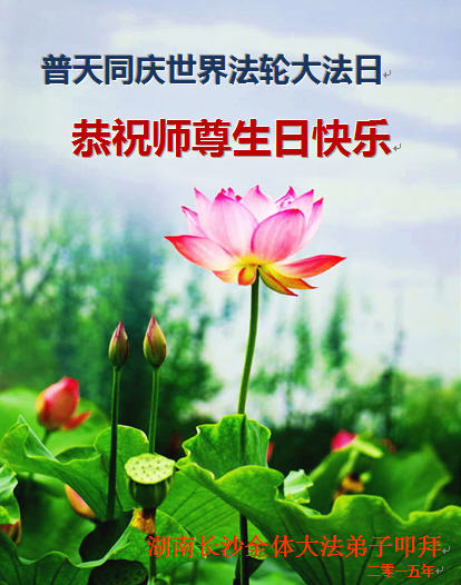 湖南长沙一学法小组大法弟子在世界法轮大法日来临之际,恭祝慈悲伟大的师尊华诞暨法轮大法弘传23周年,诚挚的感恩师尊的慈悲苦度!师父辛苦了!谢谢师尊!感恩师尊!唯有不断精進,做好三件事多救众生,坚定不移的跟师父回家。请师父放心。最后叩拜师尊。 二零一五年五月六日 湖南省长沙地区全体大法弟子祝慈悲伟大的师尊生日快乐!