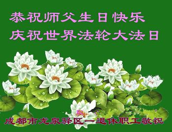 四川省成都市龙泉驿区一退休职工庆祝世界法轮大法日!恭祝师父生日快乐!
