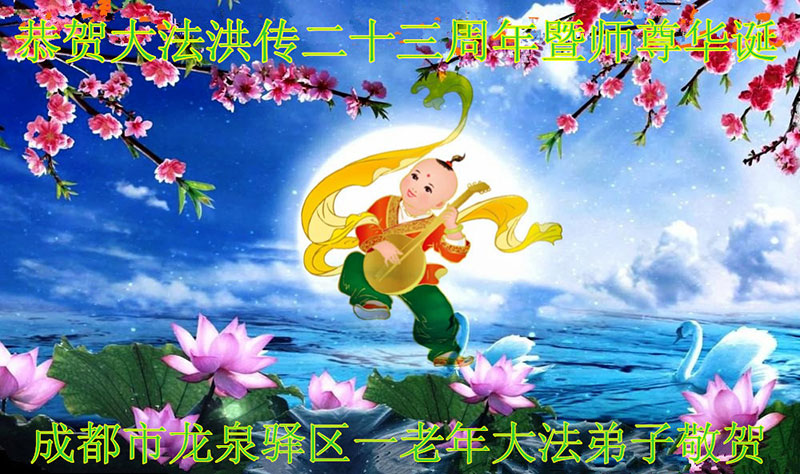 四川省成都市龙泉驿区一老年大法弟子恭贺大法洪传二十三周年暨师尊华诞!