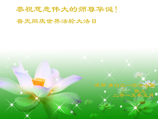 师尊您好!我们无限感恩师尊的慈悲苦度!师尊啊,今生我们能成为大法弟子是多么的幸福,是您的巨大付出和为众生巨业的承受把业力满身的我们从污浊的末劫乱世中捞出洗净;使我们能修大法真经,领悟人生真谛!我们庆幸能做师父的弟子返本归真,感恩师尊慈悲苦度和加持呵护;我们知道大法弟子的责任重大,在正法的最后时刻,我们一定要听师尊的语,精進实修,做好三件事,圆满随师还! 四川省成都青白江一学法小组大法弟子恭祝慈悲伟大的师尊生日快乐!普天同庆世界法轮大法日!