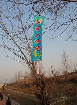 黑龙江七台河大法弟子悬挂条幅展现大法美好(图)