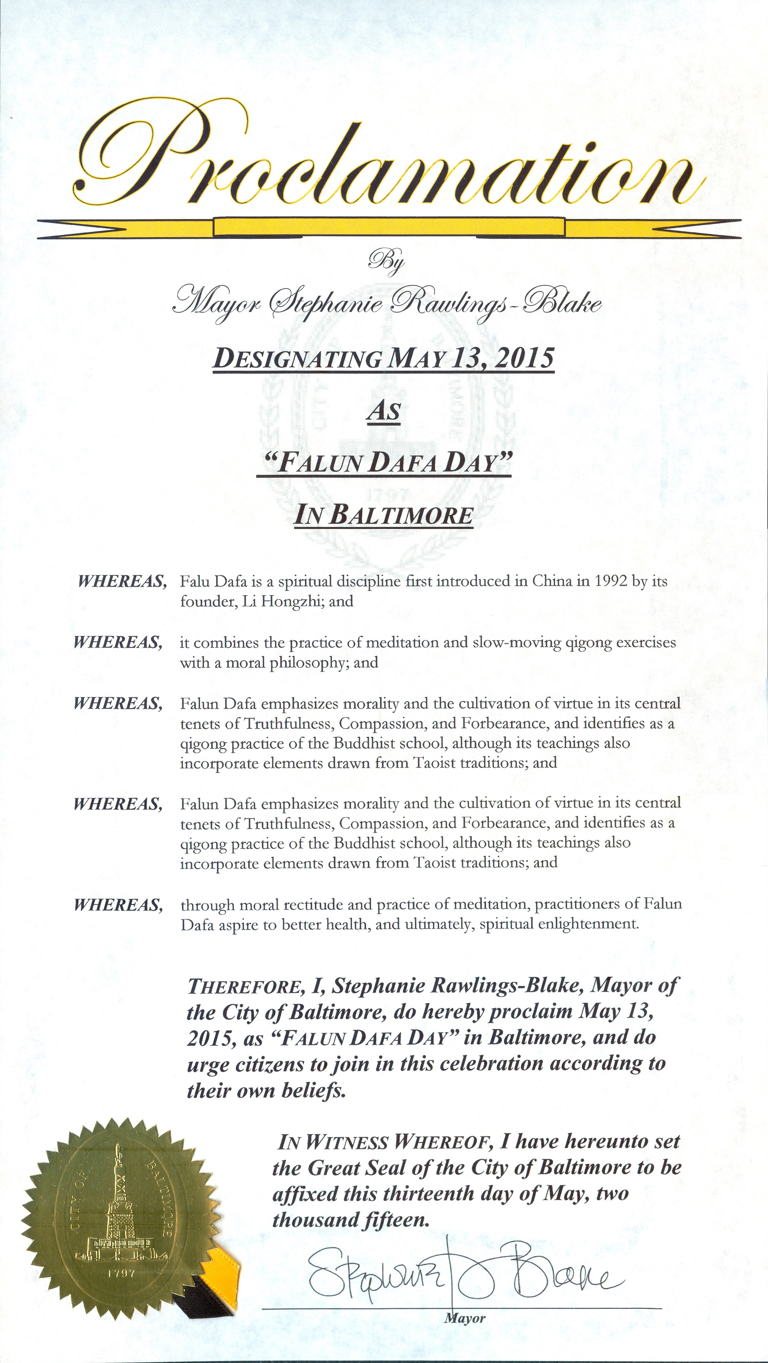 鉴于,法轮大法是由创始人李洪志先生于一九九二年传出的精神信仰; 鉴于,其将打坐和缓慢气功锻练与道德标准相结合; 鉴于,法轮大法是以“真、善、忍”为原则,强调道德和美德提升的佛家修炼功法; 鉴于,通过道德正气的提升和打坐,法轮功修炼者追求更健康的身体,与最终精神的启迪。 因此,我,斯蒂芬妮•罗林斯•布莱克,巴尔的摩市长,在此宣布二零一五年五月十三日为巴尔的摩“法轮大法日”,并呼吁民众根据自己的信仰加入这一庆典。