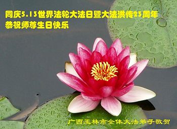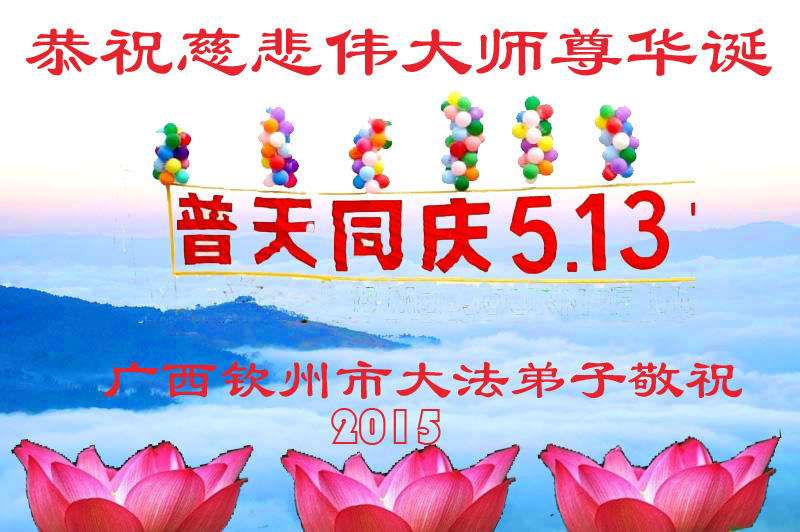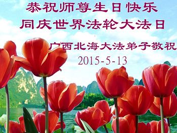 【明慧网二零一五年五月十三日】 广西玉林市全体大法弟子同庆世界法轮大法日暨大法洪传23周年!恭祝师尊生日快乐!