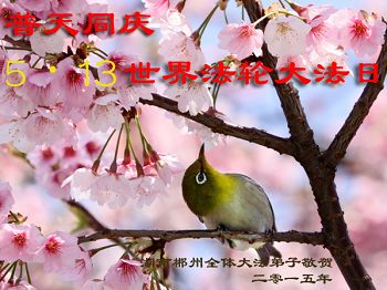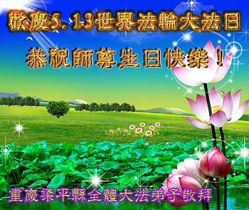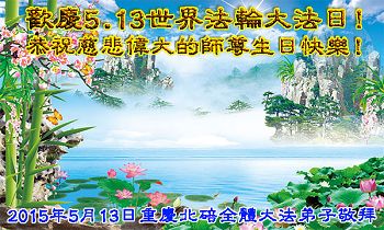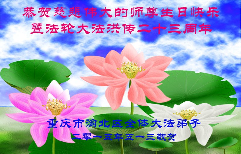 【明慧网二零一五年五月十四日】 重庆市渝北区全体大法弟子恭祝慈悲伟大的师尊生日快乐暨法轮大法洪传二十三周年!