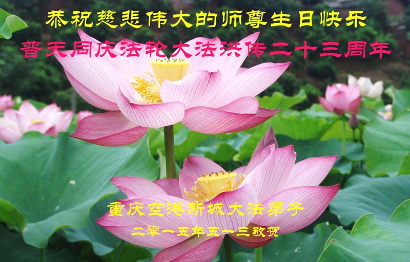 重庆空港新城大法弟子恭祝慈悲伟大的师尊生日快乐!普天同庆法轮大法洪传二十三周年!