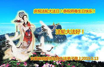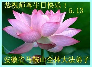 全体安徽省马鞍市大法弟子普天同庆法轮大法洪传二十三周年暨世界法轮大法日!恭祝师尊生日快乐!