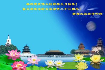 新都大法弟子恭祝慈悲伟大的师尊生日快乐!普天同庆法轮大法洪传二十三周年!