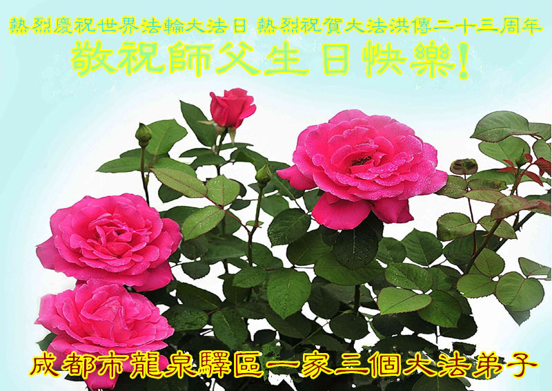 成都市龙泉驿区一家三个大法弟子热烈庆祝世界法轮大法日!热烈祝贺大法洪传二十三周年!敬祝师父生日快乐!