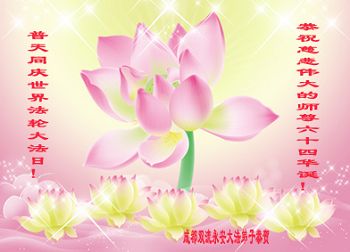 5.13贺词 《谢师恩》 师传大法苍宇新 众生业债累师心 青丝斑白似银针 慈悲众生甘露淋 育出净朵满宇莲 幸逢大法脱苦海 超凡脱俗回天庭 感谢恩师苦救度 走正助师正法路 了却人心多救人 兑现誓约了大愿 圆满功成随师还 黑龙江省大庆市乙烯一学法小组大法弟子敬祝师尊生日快乐!