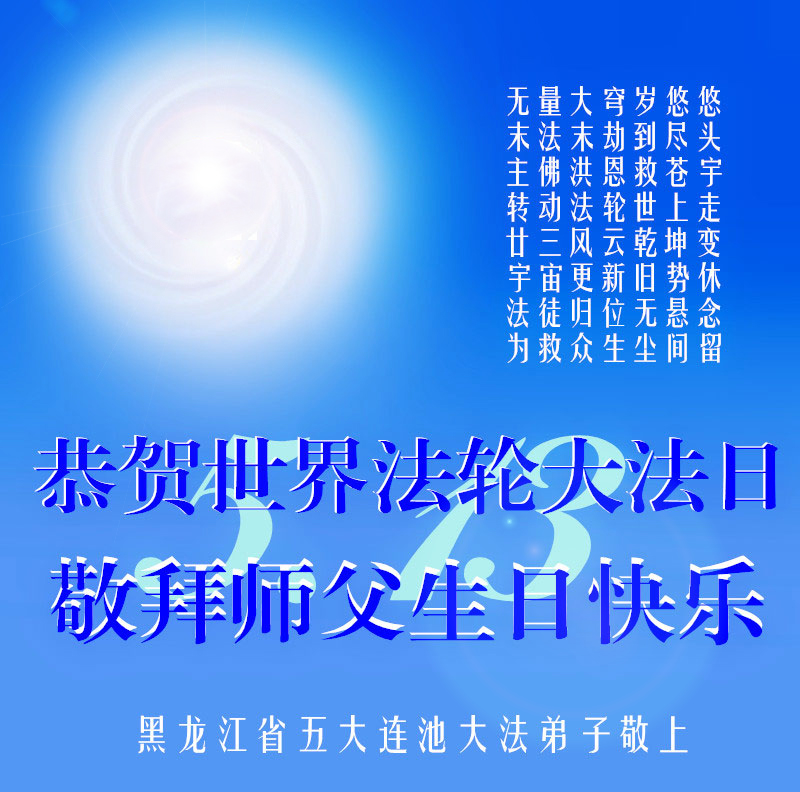 无量大穹岁悠悠 末法末劫到尽头 主佛洪恩救苍宇 转动法轮世上走 廿三风云乾坤变 宇宙更新旧势休 法徒归位无悬念 为救众生尘间留 黑龙江省五大连池大法弟子恭贺法轮大法洪传二十三周年!