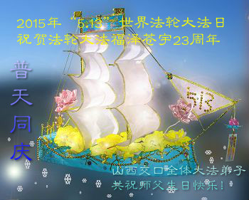 5.13世界法轮大法日 五月十三喜气洋, 各路神仙聚一堂, 同贺法轮大法日, 共祝师尊福寿长。 山西交口全体大法弟子共祝师父生日快乐!庆贺世界法轮大法日!