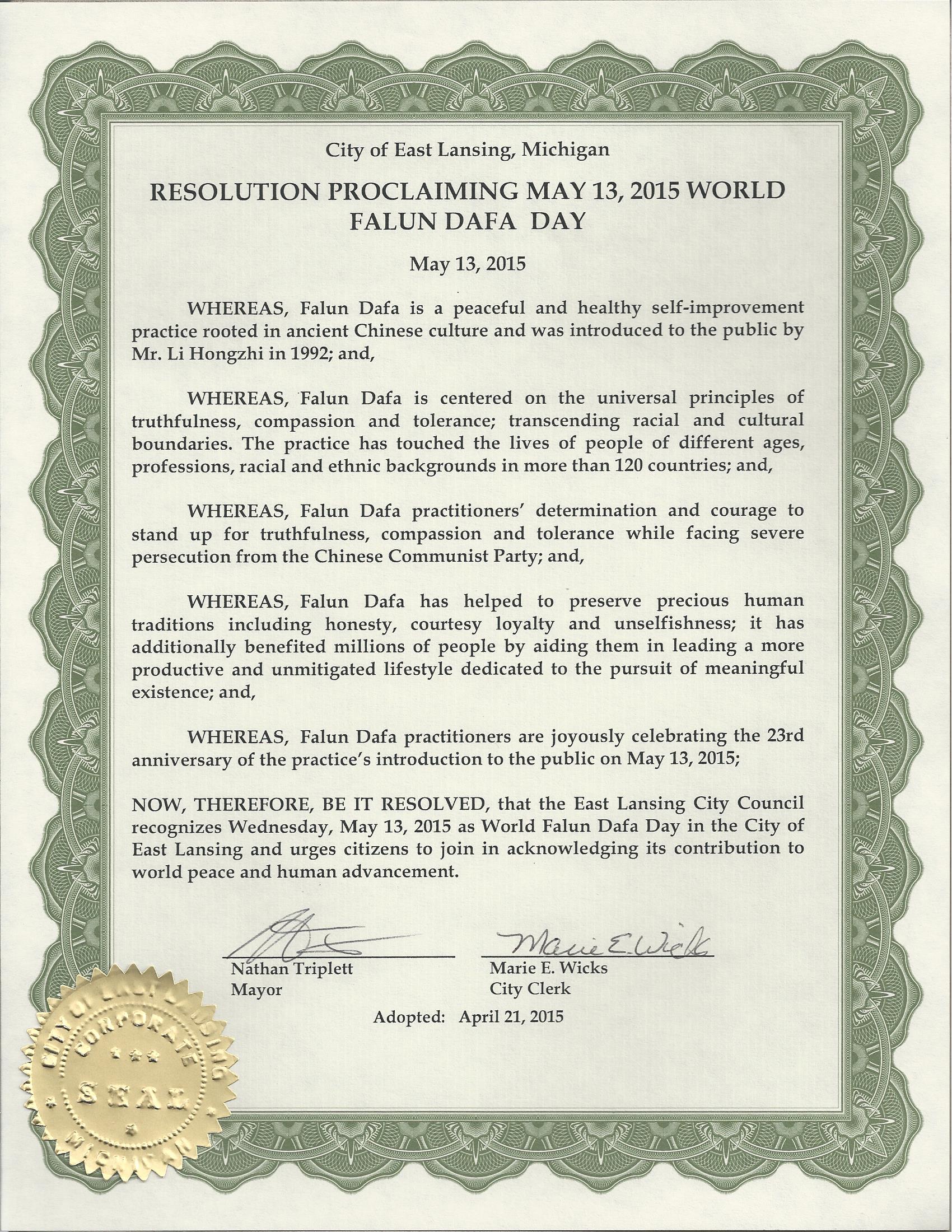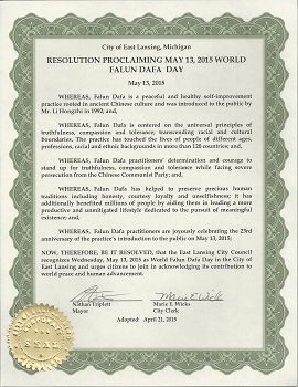 | 【明慧网二零一五年五月三十日】(明慧记者徐菁编译)二零一五年五月,密西根州东兰辛市市长纳森·普雷特(Nathan Triplett)颁发褒奖令,宣布五月十三日为东兰辛市“世界法轮大法日”。 褒奖译文如下: 鉴于,法轮大法是一个根植于中国传统文化的和平,健康的能够实现自我提升的 功法,李洪志先生于一九九二年把它并介绍给公众; 鉴于,“法轮大法是以真,善,忍的普世价值为核心,超越种族和文化界线。这种功法触及了近百个国家的不同种族背景,不同年龄,职业的人们; 鉴于,法轮大法修炼者在面临中共严酷迫害的情况下仍然维护真,善,忍普世价值的决心和勇气; 鉴于,法轮大法帮助维护人类宝贵的传统,包括诚实,礼貌的忠诚和无私奉献;它也使数以百万的人受益,使他们的生活更加有意义; 鉴于,二零一五年五月十三日是法轮大法修炼者欢庆法轮大法洪传世界二十三周年纪念日; 因此,东兰辛市议会现在通过决议,宣布二零一五年五月十三日为密西根东兰辛市世界法轮大法日,并呼吁本市公民参与褒奖法轮大法为世界和平和人类进步所作出的贡献。 东兰辛市市长 纳森•普雷特 (Nathan Triplett) 东兰辛市市秘书 玛丽•威克斯 (Marie Wicks)