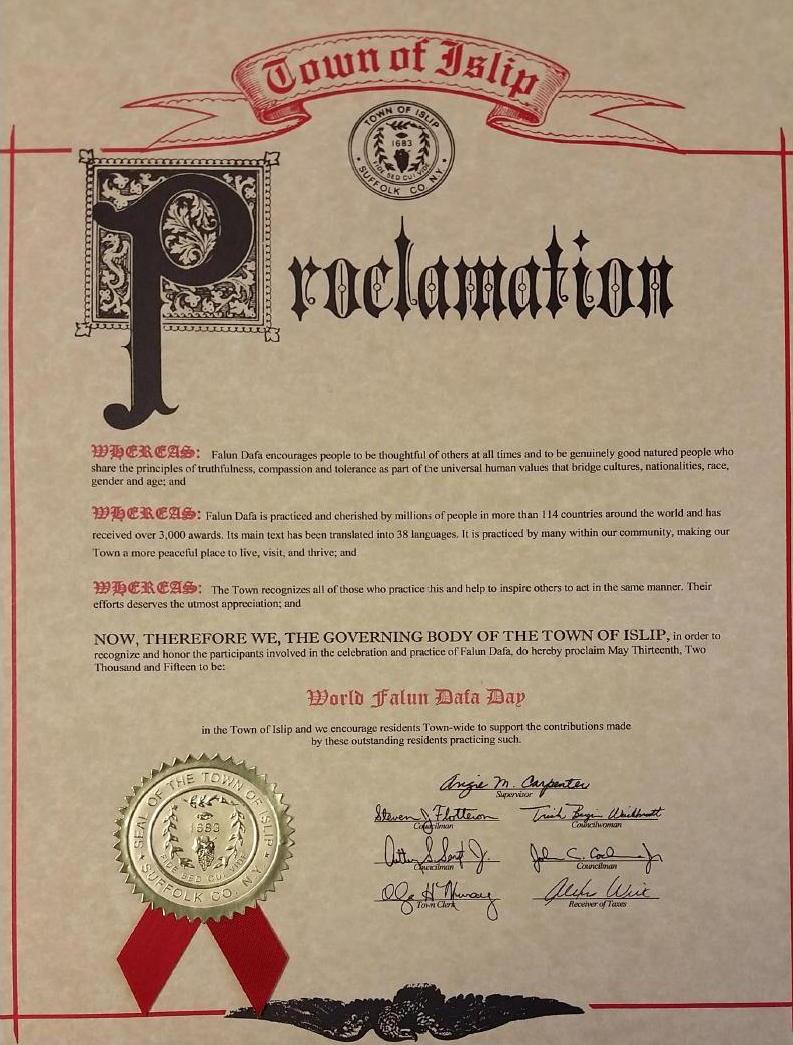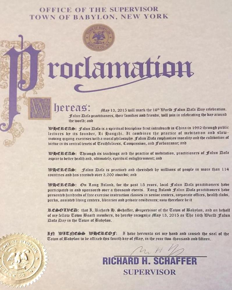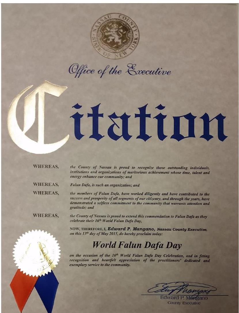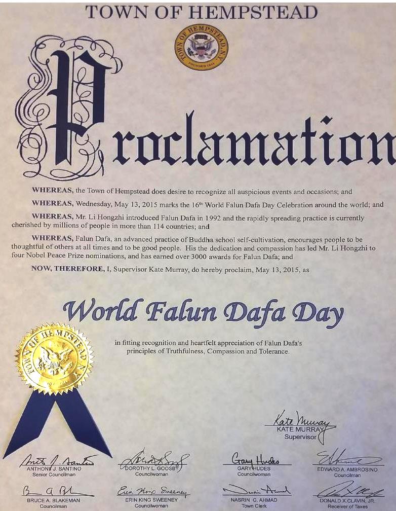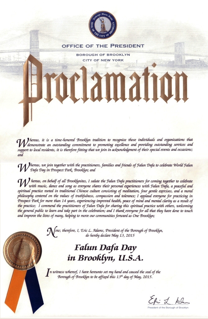【明慧网二零一五年五月三十一日】为祝贺法轮大法洪传世界二十三周年及欢庆第十六届法轮大法日,纽约市议员及多位区长郡长发来褒奖贺信,祝贺这一盛事。纽约市布碌伦区(Borugh of Brooklyn) 区长Eric Adams颁发褒奖,赞扬法轮大法给人们带来的福祉,并宣布二零一五年五月十三日为布碌伦区的法轮大法日。纽约市史坦顿岛(Borough of Staten Island) 区长James Oddo颁发感谢证书,赞扬法轮大法。纽约市议员Alan Maisel颁发褒奖证书,庆祝第十六届世界法轮大法日。纽约市议员Robert Cornegy颁发褒奖证书,庆祝五一三世界法轮大法日。纽约长岛格伦科夫市市长(Mayor of Glen Cove) Reginald Spinello颁发褒奖证书,庆祝第十六届世界法轮大法日。纽约长岛拉撒郡郡长(Nassau county executive) Edward P. Mangano颁发褒奖,赞扬法轮大法给人们带来的福祉,并宣布二零一五年五月十三日为世界法轮大法日。纽约长岛萨福克郡(Suffolk County) Steven Bellone颁发褒奖,赞扬法轮大法给人们带来的福祉,并宣布二零一五年五月十三日为福克郡的世界法轮大法日。纽约长岛布鲁克海文镇镇长(Town of brookhaven) Edward P. Romaine颁发褒奖,赞扬法轮大法给人们带来的福祉,并宣布二零一五年五月十三日为布鲁克海文镇的世界法轮大法日。纽约长岛斯特德镇镇长 (Town of Hempstead) Kate Murray颁发褒奖,赞扬法轮大法给人们带来的福祉,并宣布二零一五年五月十三日为世界法轮大法日。纽约长岛巴比伦镇镇长 (Town of Babylon) Rich Schaffer颁发褒奖,赞扬法轮大法给人们带来的福祉,并宣布二零一五年五月十三日为世界法轮大法日。纽约长岛绍斯霍尔德镇镇长(Town of Southold) Scott A. Russell颁发褒奖,赞扬法轮大法给人们带来的福祉,并宣布二零一五年五月十三日为世界法轮大法日。纽约长岛河源镇镇长(Town of Riverhead)Sean M. Walter颁发褒奖,赞扬法轮大法给人们带来的福祉,并宣布二零一五年五月十三日为世界法轮大法日。纽约长岛艾斯利普镇镇长(Town of Islip) Angie M. Carpenter颁发褒奖,赞扬法轮大法给人们带来的福祉,并宣布二零一五年五月十三日为世界法轮大法日。