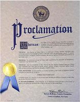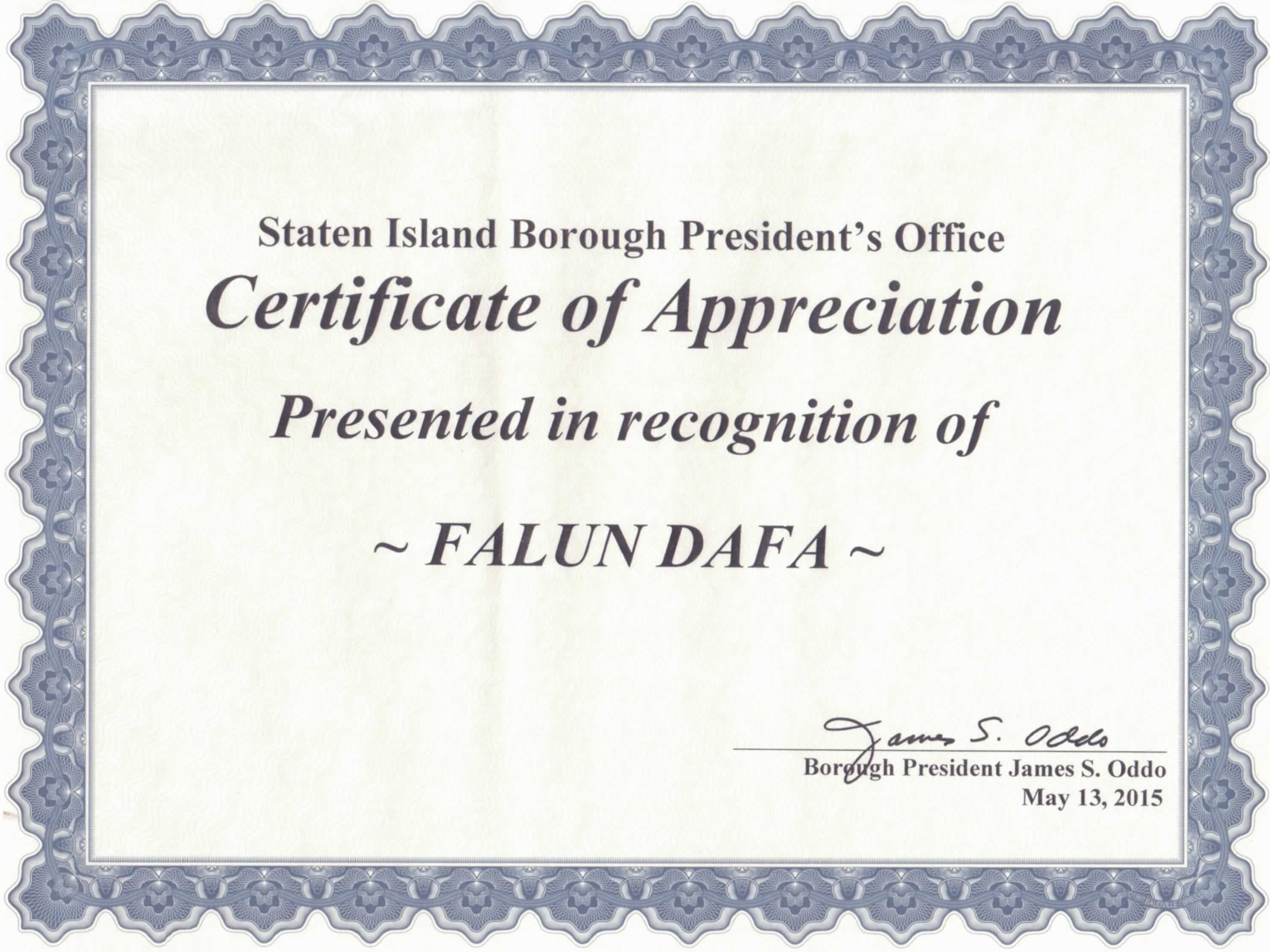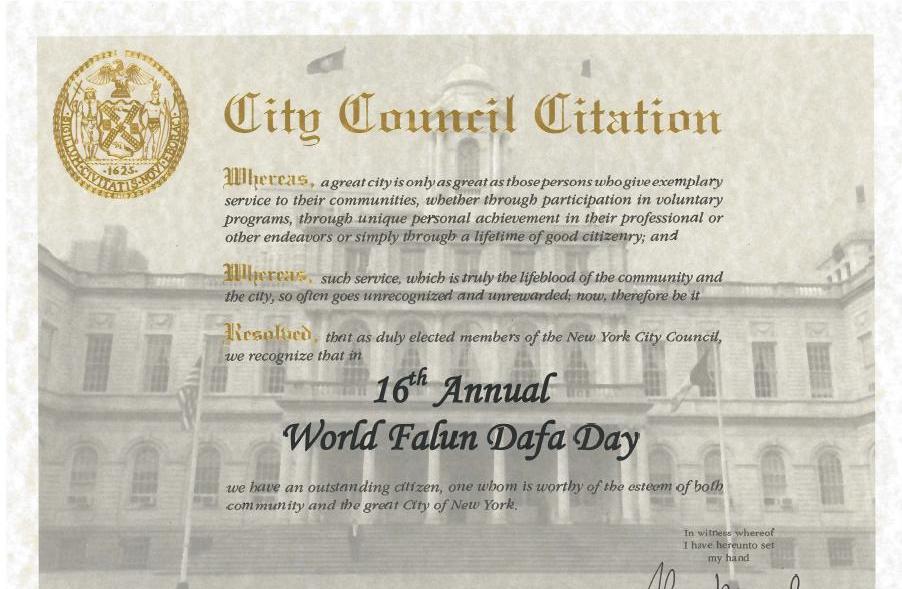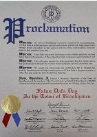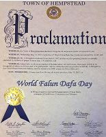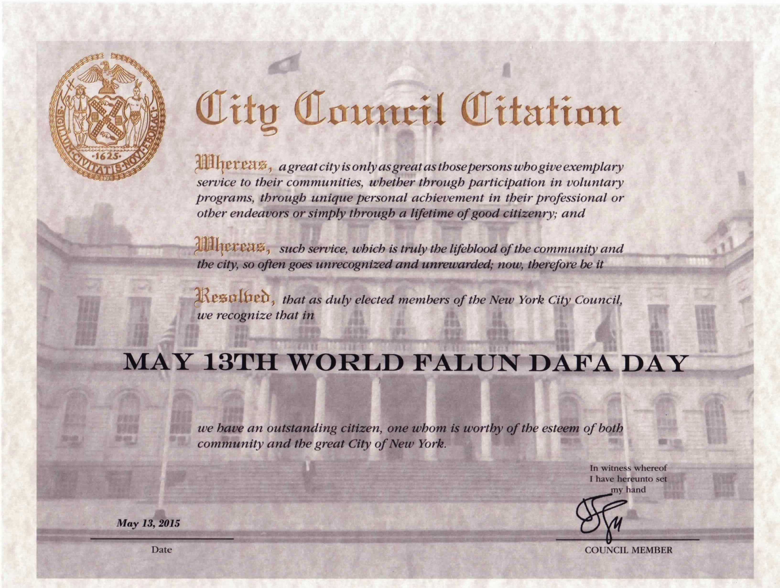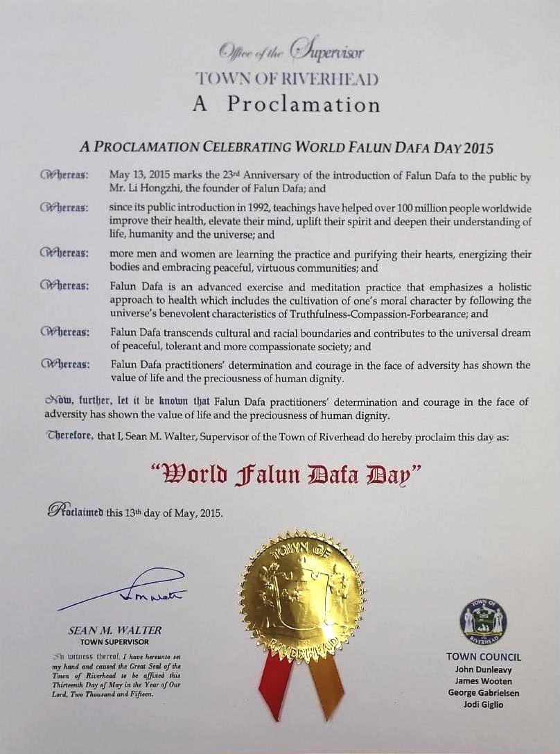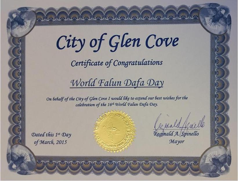 【明慧网二零一五年五月三十一日】为祝贺法轮大法洪传世界二十三周年及欢庆第十六届法轮大法日,纽约市议员及多位区长郡长发来褒奖贺信,祝贺这一盛事。纽约市布碌伦区(Borugh of Brooklyn) 区长Eric Adams颁发褒奖,赞扬法轮大法给人们带来的福祉,并宣布二零一五年五月十三日为布碌伦区的法轮大法日。纽约市史坦顿岛(Borough of Staten Island) 区长James Oddo颁发感谢证书,赞扬法轮大法。纽约市议员Alan Maisel颁发褒奖证书,庆祝第十六届世界法轮大法日。纽约市议员Robert Cornegy颁发褒奖证书,庆祝五一三世界法轮大法日。纽约长岛格伦科夫市市长(Mayor of Glen Cove) Reginald Spinello颁发褒奖证书,庆祝第十六届世界法轮大法日。纽约长岛拉撒郡郡长(Nassau county executive) Edward P. Mangano颁发褒奖,赞扬法轮大法给人们带来的福祉,并宣布二零一五年五月十三日为世界法轮大法日。纽约长岛萨福克郡(Suffolk County) Steven Bellone颁发褒奖,赞扬法轮大法给人们带来的福祉,并宣布二零一五年五月十三日为福克郡的世界法轮大法日。纽约长岛布鲁克海文镇镇长(Town of brookhaven) Edward P. Romaine颁发褒奖,赞扬法轮大法给人们带来的福祉,并宣布二零一五年五月十三日为布鲁克海文镇的世界法轮大法日。纽约长岛斯特德镇镇长 (Town of Hempstead) Kate Murray颁发褒奖,赞扬法轮大法给人们带来的福祉,并宣布二零一五年五月十三日为世界法轮大法日。纽约长岛巴比伦镇镇长 (Town of Babylon) Rich Schaffer颁发褒奖,赞扬法轮大法给人们带来的福祉,并宣布二零一五年五月十三日为世界法轮大法日。纽约长岛绍斯霍尔德镇镇长(Town of Southold) Scott A. Russell颁发褒奖,赞扬法轮大法给人们带来的福祉,并宣布二零一五年五月十三日为世界法轮大法日。纽约长岛河源镇镇长(Town of Riverhead)Sean M. Walter颁发褒奖,赞扬法轮大法给人们带来的福祉,并宣布二零一五年五月十三日为世界法轮大法日。纽约长岛艾斯利普镇镇长(Town of Islip) Angie M. Carpenter颁发褒奖,赞扬法轮大法给人们带来的福祉,并宣布二零一五年五月十三日为世界法轮大法日。