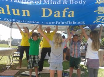 | 【明慧网二零一五年九月十一日】二零一五年初,神韵晚会在美国圣地亚哥创下连续九场,场场一票难求的票房纪录。很多人在观看神韵后,被节目中展现的法轮功学员“真、善、忍”的精神所感召,纷纷寻找、主动了解法轮功。近四个月来,约有六千名圣地亚哥民众加入订阅圣地亚哥法轮功学员在脸书(Facebook)创建的介绍法轮功的专页,数百人在专页上留言,许多人报名参加免费学习班或每周在炼功点炼功。 目前,圣地亚哥法轮功学员除了在一些图书馆和公园定期举办免费教功班外,还应邀到各个社区中心和学校,介绍功法并教功。 在空军基地青年中心,二十多名师生认真学炼第五套功法,全部当场能够双盘。在Miramar 社区小学 教学生学炼法轮功 2)在Miramar 社区小学教学生学炼法轮功在City Height 城市高地社区中心教功 4)在密纳梅沙(Mira Mesa)社区图书馆教功在南部PENN Athletic社区中心教功 6)在南克莱尔门特(S. Clairement)社区中心教功