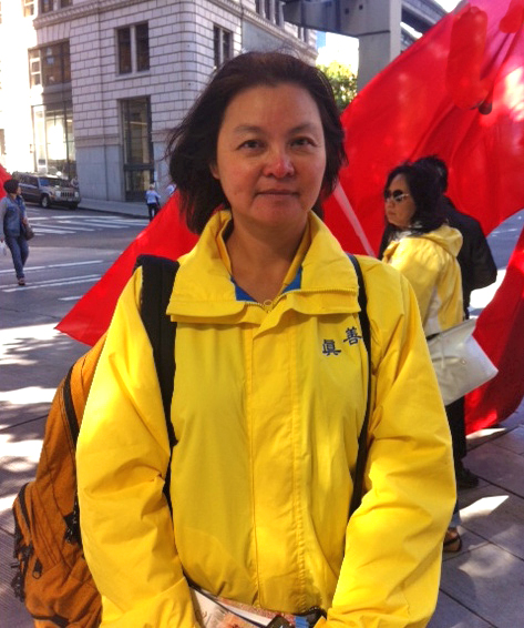 来自圣荷西的电脑工程师苏南对记者说:“我是法轮功学员。法轮功是古老的修炼功法。一九九九年中共开始迫害法轮功。目前中共还在摘取法轮功学员的器官。欧盟已经通过决议要求中共停止这种血腥暴行。美国国会也正在提出类似的决议。我来这里就是要告诉人们,中共仍在杀人。”  图4:来自旧金山的法轮功学员凯西·马 |