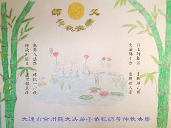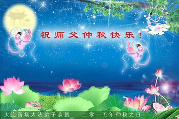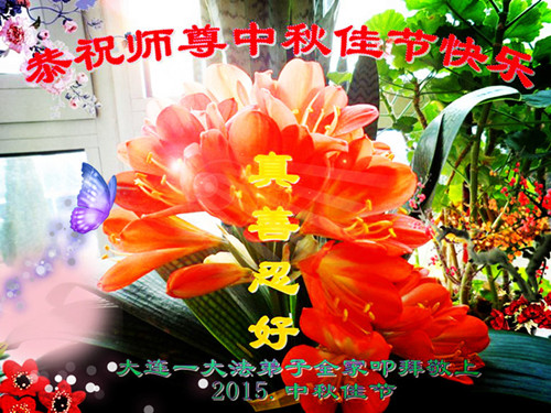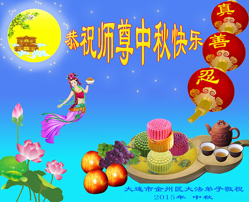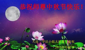 在中秋节即将来临之际,辽宁大连家庭学法小组恭祝慈悲伟大的师尊中秋节快乐!我们还要不断精進,遇事向内找,做好三件事,做合格的大法弟子! 2015年9月17日 辽宁省大连物化所大法弟子恭祝师尊中秋快乐!