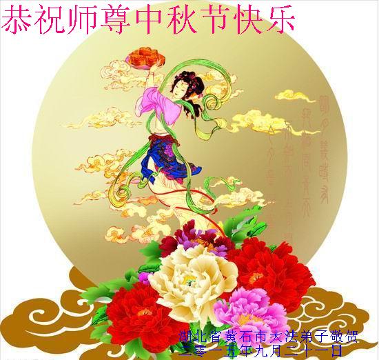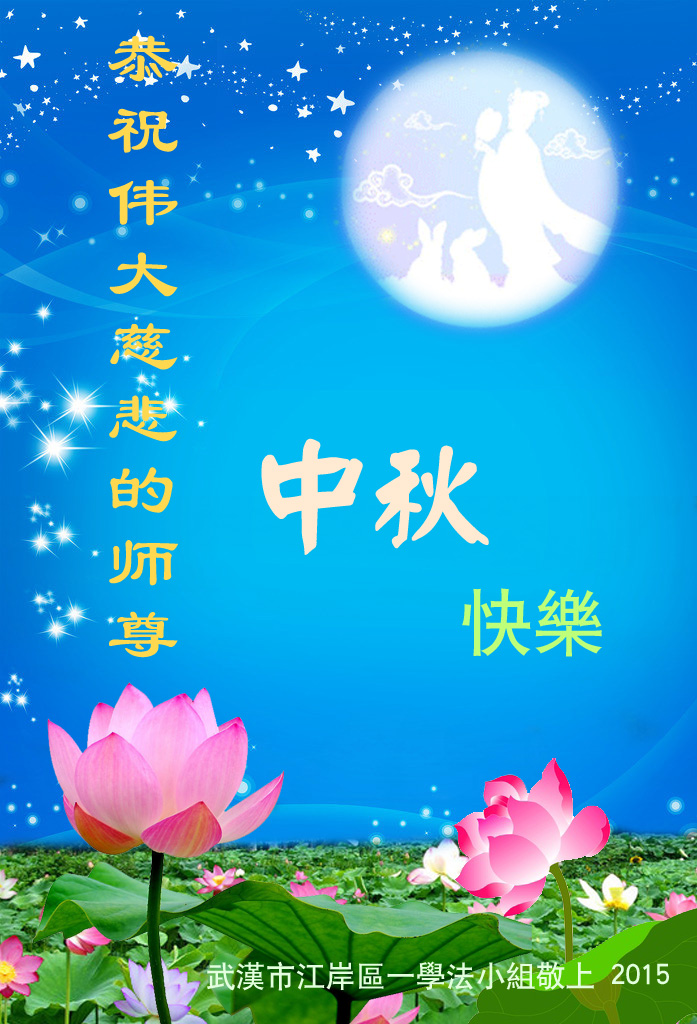师尊您好!您辛苦了!弟子们给您磕头了! 师尊您为弟子们、为救度众生操尽了心,我们每一步的提高都渗透着您的无数心血和巨大承受。在修炼中,因不会修,不会向内找,出现不少的漏。特别是这次的诉江,虽然控告书也递交了,但在过程中暴露出多少执着心,令师尊失望!您为弟子们付出了太多太多!而不求任何回报,把每个弟子修炼的路都安排的相当细密。在此弟子们由衷的道一声:师尊谢谢您了!在以后回归的路上我们不要带人的观念,什么都不要想,不要起任何心,不要被常人的形势带动,无怨无悔的就这样在平凡的生活中,默默的、用心的做好“三件事”,救度众生,兑现誓约。理智、清醒的走好师父精心安排的返本归真的神路。 武汉市黄陂区全体大法弟子跪拜师尊!合十敬上! 二零一五年九月十九日 武汉硚口区一学法小组和湖北母女二人恭祝师尊中秋节快乐!