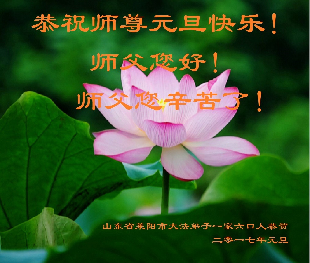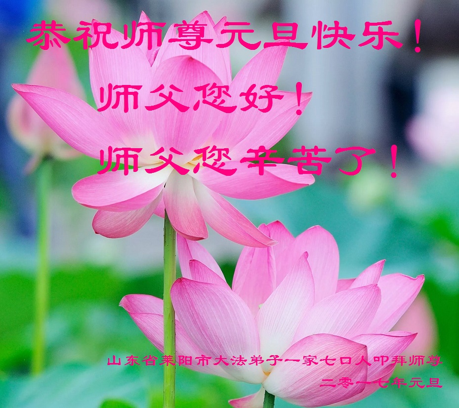 山东省莱阳市一家六位大法弟子叩拜师尊,恭祝慈悲伟大的师尊元旦佳节快乐! 山东省莱阳市大法小弟子恭祝慈悲伟大的师尊元旦佳节快乐! 山东省莱阳市一学法小组四位大法弟子叩拜师尊,恭祝慈悲伟大的师尊元旦佳节快乐! 师父您好!师父您辛苦了!在二零一七年元旦到来之际,我们小组的四位弟子深深的感谢师尊的救度之恩!在新的一年里,我们会更加精進实修,谨遵师父的教诲,认认真真的多学法,学好法。定时发正念,清除内在的、外在的一切干扰和邪恶生命与因素,在修好自己的基础上,多救人。完成使命,兑现誓约,让师父少一份操劳,多一份欣慰。 山东省莱阳市大法弟子一家七口人恭祝慈悲伟大的师尊元旦佳节快乐! 山东省莱阳市河洛镇全体大法弟子恭祝慈悲伟大的师尊元旦佳节快乐! 山东省潍坊市大法弟子和全家人恭祝师尊佳节快乐! 山东省莱阳市大法弟子母子俩恭祝慈悲伟大的师尊元旦佳节快乐! 山东省莱阳市大法弟子母女二人恭祝慈悲伟大的师尊元旦佳节快乐! 山东省莱阳市一位大法弟子恭祝慈悲伟大的师尊元旦佳节快乐! 山东省莱阳市一学法小组三位大法弟子恭祝慈悲伟大的师尊元旦佳节快乐!