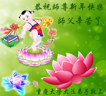 我九七年在大学校园开始学法。自从去年师父从新强调了修炼的严肃,真的感觉如雷贯耳,当真正实修自己时才发现大法是如此的严肃,修炼机缘是如此的珍贵,自己能得到大法又是何等的幸运!借此新年之际,弟子用最最纯净的心态恭祝师父新年快乐!并向师父保证一定严格要求自己真正实修自己,不再辜负师父的慈悲苦度,一定尽自己的一切所能圆容好师父所要的,走好走正师父安排的修炼路,做一名合格的“正法时期大法弟子”,圆满随师还! 重庆大学大法弟子敬祝师父新年快乐!
