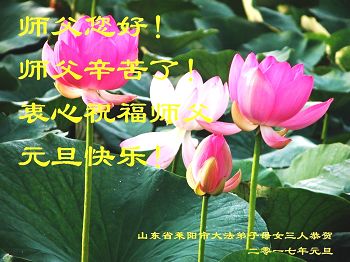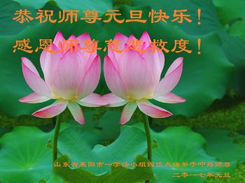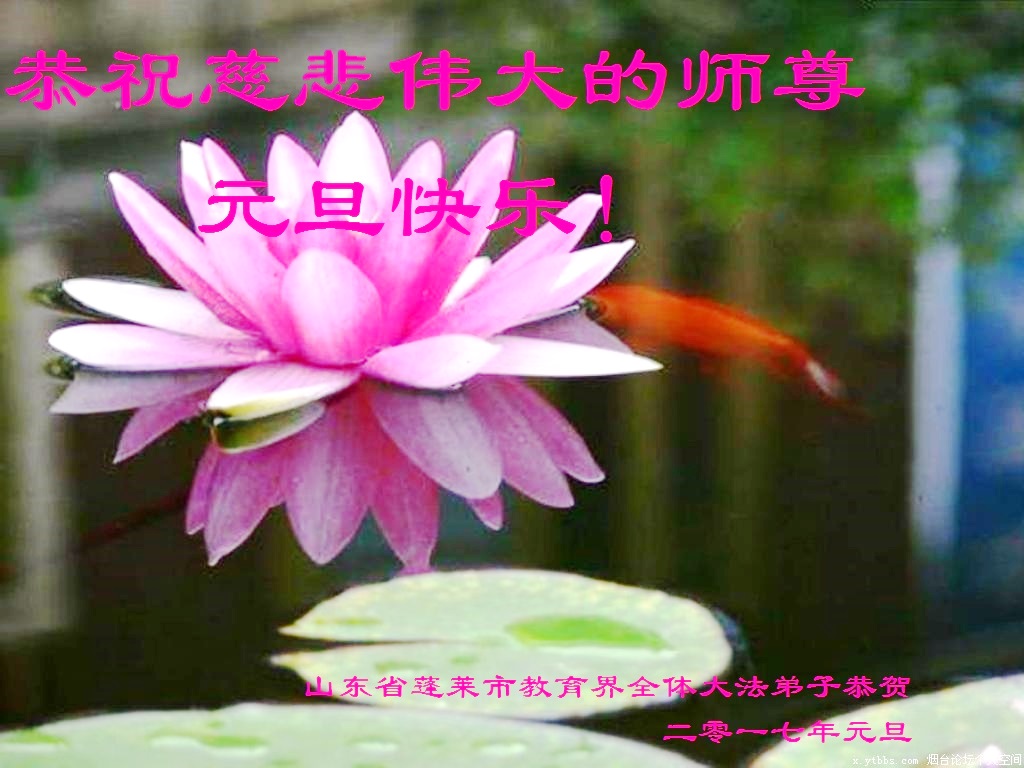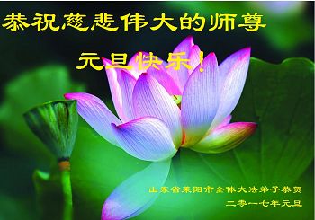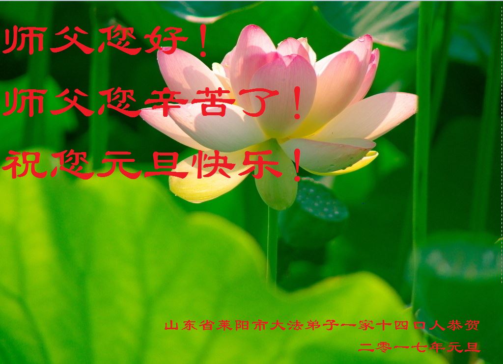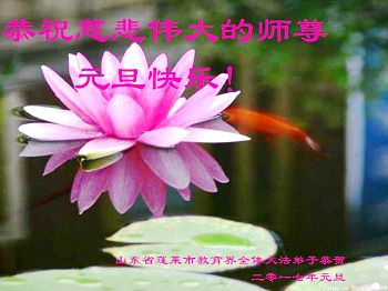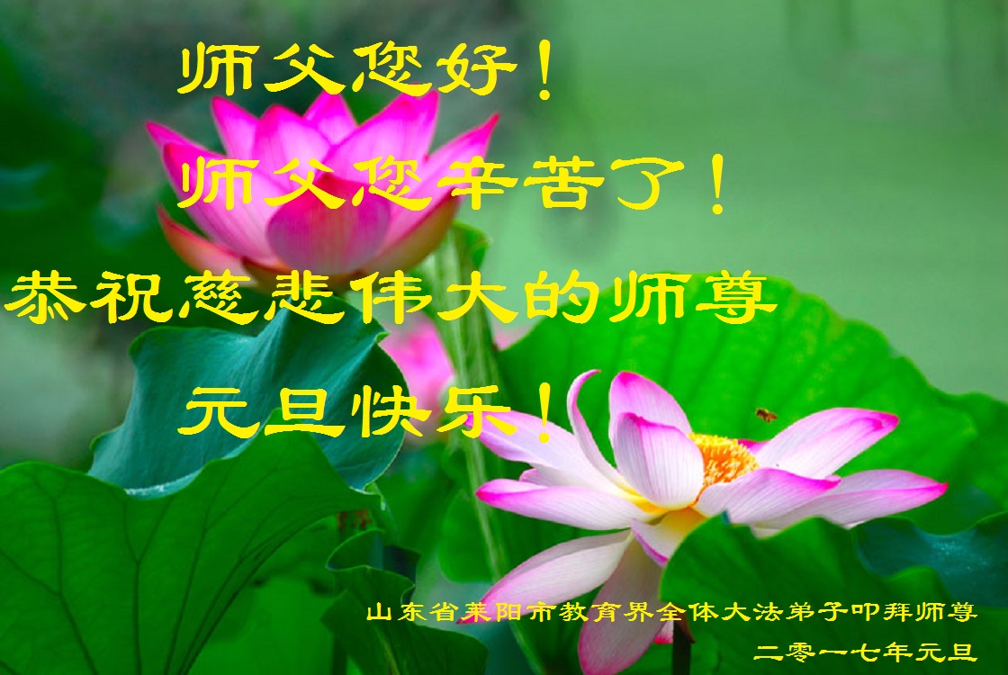 1、二零一七年元旦佳节来临之际,山东省莱阳市全体大法弟子恭祝慈悲伟大的师尊元旦佳节快乐! 我们全体大法弟子衷心的道一声:师父您好!师父您辛苦了! 在新的一年里,我们会谨遵师尊的教诲,更加精進,认真多学法,学好法,发正念,讲真相,做好三件事。 2、山东省莱阳市农村大法弟子恭祝慈悲伟大的师尊元旦佳节快乐! 3、二零一七年元旦佳节来临,山东省莱阳市柏林庄镇全体大法弟子恭祝慈悲伟大的师尊元旦节快乐! 4、山东省莱阳市教育界全体大法弟子恭祝慈悲伟大的师尊元旦佳节快乐! 5、山东省莱阳市医务界全体大法弟子恭祝慈悲伟大的师尊元旦佳节快乐! 6、山东省莱阳市一学法小组四位大法弟子恭祝慈悲伟大的师尊元旦佳节快乐! 7、山东省莱阳市大法弟子母女三人恭祝慈悲伟大的师尊元旦佳节快乐! 8、山东省莱阳市三个学法小组十六位大法弟子恭祝慈悲伟大的师尊元旦佳节快乐! 9、山东省潍坊市教育界大法弟子恭祝慈悲伟大的师尊元旦佳节快乐! 10、山东省莱阳市大法弟子一家十四口人恭祝慈悲伟大的师父元旦佳节快乐! 11、山东省蓬莱市教育界大法弟子恭祝慈悲伟大的师尊元旦佳节快乐!