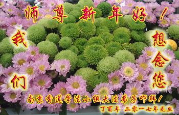 我们一定努力做好三件事,学好法多救众生,不辜负师尊的期望,让师尊放心。 江苏省南京市外地一大法弟子恭祝师尊新年好!