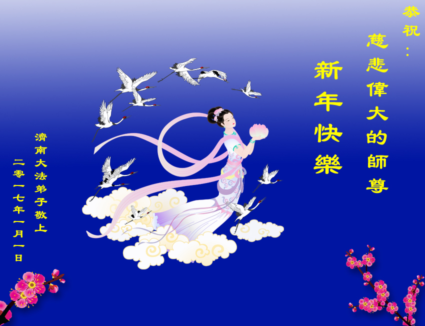 在新的一年即将来临之际,弟子怀着对师父万分感激的心情祝贺师父新年快乐!弟子谢谢师父的慈悲救度,更谢谢师父对我们家在2016年突然得了癌症的妹妹和儿媳妇的救度,使她们的身体很快恢复。如果不是师父的慈悲救度,现今我们家不知道有多痛苦和难过哪。是师父,是法轮大法给我们全家带来了幸福和美好。今后弟子会多学法,多救人,以报师恩。 山东省济南市东郊大法弟子恭祝师父新年快乐!