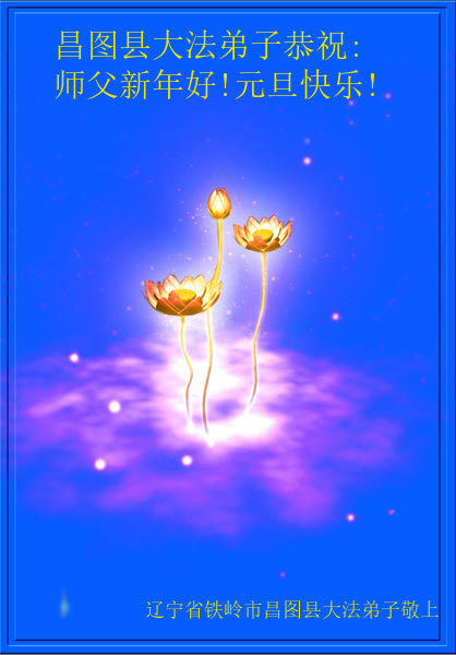 辽宁鞍山四个学法小组的大法弟子恭祝师尊新年快乐!恭祝师父在新的一年里事事顺利、心想事成。我们决不辜负师尊的慈悲救度,实修自己,多救人,兑现来世的誓约。 辽宁抚顺一对老年大法弟子敬祝师父新年快乐!
