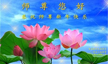 师父您好! 新年来临,弟子真想制作一张送给师父,目前弟子还不会制,只能用语言表达弟子对师父最诚挚的问候。师父您好!师父辛苦了!恭祝师尊新年好! 大陆青岛平度大法弟子母子 山东省青岛两个学法小组,全体同修恭祝师尊新年好!