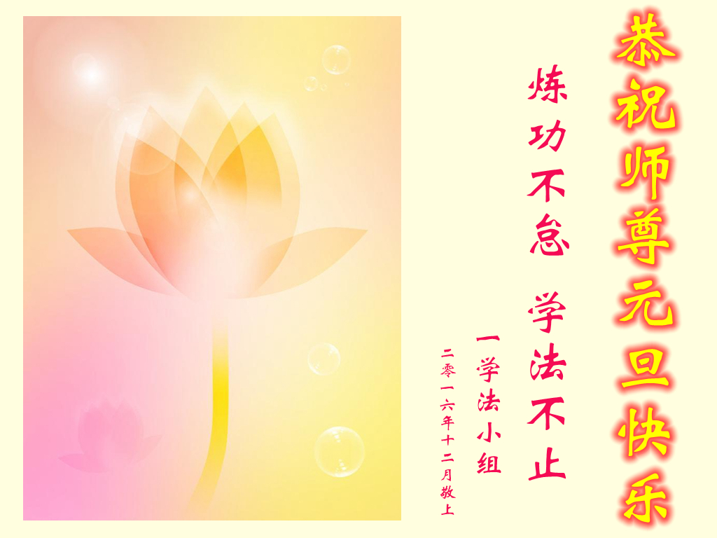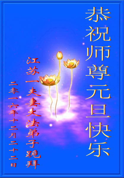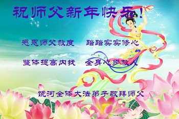 大陆一老年大法弟子及全家恭祝慈悲伟大的师尊新年快乐!万事如意。多一些安慰,少一些操劳。在新的一年里,更加精進实修,早日跟师尊回家。 大陆三个学法小组和资料点的大法弟子恭祝师尊元旦快乐!