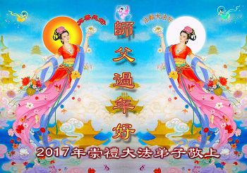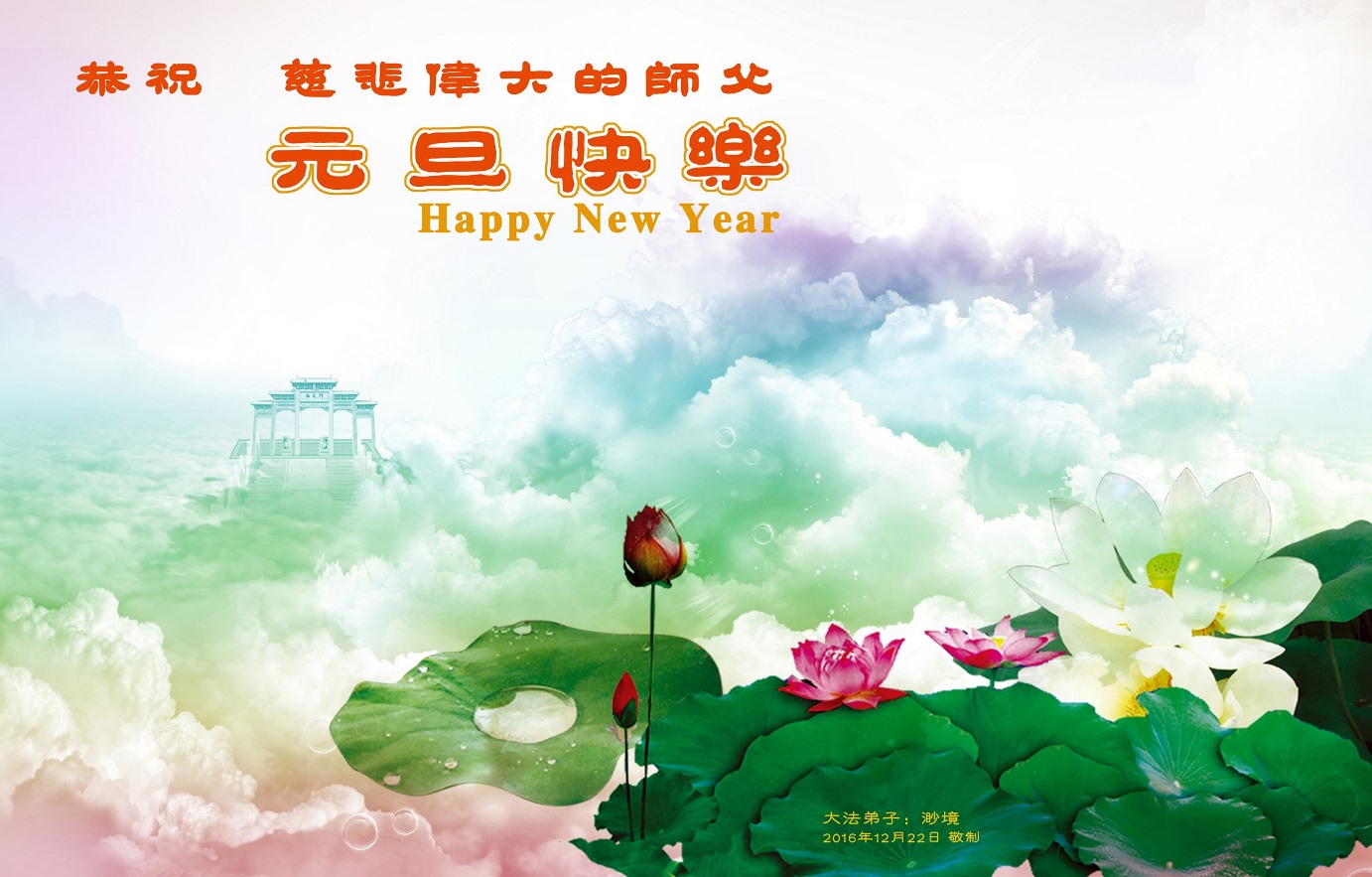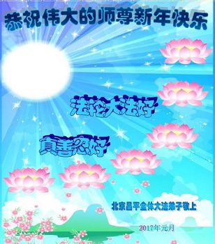 2017年新年即到,回顾过去一年,我们在伟大慈悲师尊的看护下,形成整体,相互配合、协调,互相鼓励,在做好三件事上,放下人心,放下自我的观念和执着中不断精進,抓紧救度众生。请师尊放心,我们会学好法,在大法中不断归正,在实修中少一些遗憾,在一思一念中多份正念。在精進实修的路上圆满随师还。 大陆一大法弟子全家敬祝师父元旦和新年快乐!
