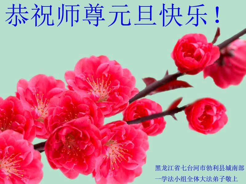 恭祝师父元旦快乐!请师父多一份欣慰少一份操劳。在这一年里我们要更加精進完成我们的愿望和使命,决不辜负您的期望。跪拜 黑龙江省七台河市勃利县城南部一学法小组全体大法弟子恭祝师尊元旦快乐!
