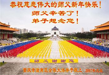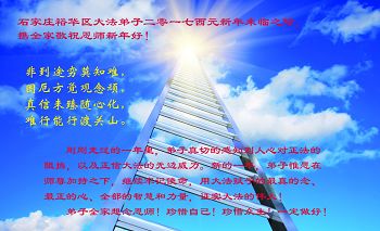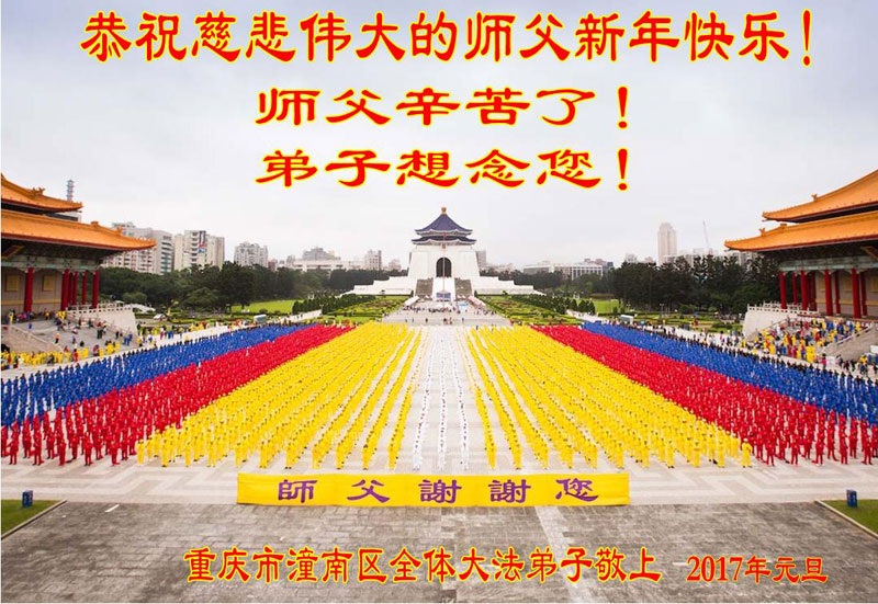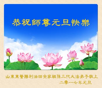 | 【明慧网二零一六年十二月三十日】二零一七年元旦到来之际,中国大陆各地区、各阶层、各行业的大法弟子纷纷把发自内心的节日贺词、贺卡等寄给明慧网,表达对李洪志师父的感恩与新年问候。大法弟子们都感到师父用巨大承受延续来的时间的宝贵,大法弟子必须珍惜时间,珍惜每一位有缘的众生。 山西太原大法弟子说:“珍惜师尊用巨大承受、无量付出所延续来的宝贵时间,做到修己与救人并重,不辱使命、兑现誓约,回报师尊的慈悲救度之恩!” 一位南京大法弟子表示,人身难得,中土难生,正法难遇,全此三者幸莫大焉! 山东省潍坊市大法弟子说:“请师父放心,我就听师父的话,修好自己快救人。” 武汉大法弟子说:“我们身边绝大多数都是修炼了二十多年的老弟子,在过去的岁月,无论风云如何变幻,我们都不曾动摇对师尊、对大法的坚信与感恩。风雨过后的我们会更加坚强。” 安徽黄山市大法弟子恭祝师尊过年好!他们表示,在神的路上奋力前行,珍惜每一个可贵的中国人,多救人。 以下为分别来自河北、山西、山东、黑龙江、江苏、安徽、云南、广东、陕西、湖南、贵州、福建、广西、辽宁、重庆、湖北等地大法弟子问候师尊的贺词。 河北石家庄大法弟子二零一七元旦问候师尊!石家庄裕华区大法弟子二零一七公元新年来临之际,携全家敬祝恩师新年好! 非到途穷莫知难, 困厄方觉观念顽, 真信未臻随心化, 难行能行渡关山。 刚刚走过的一年里,弟子真切的感知到人心对正法的阻挡,以及正信大法的无边威力。新的一年,弟子惟愿在师尊加持之下,继续牢记使命,用大法赋予的最真的念、最正的心、全部的智慧和力量,证实大法的伟大! 弟子全家想念恩师!珍惜自己!珍惜众生!一定做好! 山西太原全体大法弟子恭祝师尊新年快乐!正法洪势迅猛推進,时间之神将我们带入了新的一年。 值此2017年新年到来之际,山西太原全体大法弟子恭祝师尊新年快乐! 在正法進入尾声的有限时间里,我们要紧跟正法進程,顺应天象变化,持之以恒做好三件事。在向内找、修自身的同时,勇于承担起正法时期大法弟子责无旁贷的使命和义不容辞的职责;珍惜师尊用巨大承受、无量付出所延续来的宝贵时间,做到修己与救人并重,不辱使命、兑现誓约,回报师尊的慈悲救度之恩! 山西太原全体大法弟子敬拜 山东东营大法弟子恭祝伟大的师尊元旦快乐!新的一年来临,是伟大的师尊为众生太多太多的操劳才换来这崭新的一页。弟子唯有跟上正法進程,不断做好“三件事”,才不辜负师尊的教导和期盼。在此,弟子恭祝伟大的师尊元旦快乐! 山东东营大法弟子 二零一六年十二月十五日 “就听师父的,一定按照师父的要求做” 黑龙江省大兴安岭塔河县老年大法弟子给师尊拜年师父新年好!我今天给您拜年了!在邪*党-迫害的十七年,别人说什么我都不听,就听师父的,我一定按照师父的要求做,跟师父走。 黑龙江大兴安岭塔河县一老年大法弟子敬拜 “人身难得,中土难生,正法难遇,全此三者幸莫大焉”──南京江宁大法弟子恭祝慈悲伟大的师尊新年快乐!弟子深知以前荒废的时间只有通过现在不断的精進、奔跑追赶,才能有所弥补。感恩师尊用无法想象的承受为我们延续来的能够救人的时间,弟子当万分珍惜。 人身难得,中土难生,正法难遇,全此三者幸莫大焉!我们幸运至极,我们得了人身,我们生在中土,创世主救人的佛法在洪传。愿世人明白的一面也能珍惜这万古不遇的机缘,快快明真相,三:退.保平安! “珍惜每一个可贵的中国人,珍惜每一个曾得过法的同修” 安徽黄山市全体大法弟子恭祝慈悲伟大的师尊过年好!在师父正法所剩不多的时间里,弟子们当勇猛精進,在神的路上奋力前行,珍惜每一个可贵的中国人,珍惜每一个曾得过法的同修,助师正法,救度众生,帮助掉队的同修,圆容师父所想所要。惟愿师尊笑,只有多救人。 云南省玉溪市红塔区全体大法弟子恭祝师父元旦快乐!在师父用巨大的承受所延续来的最后的时间里,弟子们扎扎实实的向内找修好自己,圆容整体,站在真正为他的基点上用慈悲与善念多救度众生,兑现自己来时的洪愿。圆满随师还! 云南省玉溪市红塔区全体大法弟子叩谢恩师!恭祝师父新年快乐! 山西省晋城市一大法弟子恭祝慈悲伟大的师尊元旦快乐!尊敬的师父您好!您辛苦了!您给予弟子太多太多,弟子无以回报,愧对师父,今年入冬以来,师父连续发表了几篇经文,每一篇经文弟子都认真拜读,都是对弟子的鞭策,“棒喝”我一定按师尊的《提醒》做好大法弟子应该做好的三件大事,保证每天的修炼,救度更多的众生,回到美好的家园。跪拜恩师!祝师尊元旦快乐! 山西省晋城市一大法弟子合十!跪拜! 广东省珠海市大法弟子恭祝师尊元旦快乐!师尊好!恭祝师尊元旦快乐! 回首弟子走过的修炼路,感谢师尊的慈悲看护。弟子要多学法,时时向内找,不断精進,修炼如初。愿师尊少一份操劳,多一份微笑。 陕西省西安市南郊大法弟子祝愿慈悲伟大的师尊元旦快乐!在2017年新年即将到来之际,陕西省西安市南郊大法弟子祝愿慈悲伟大的师尊元旦快乐!在正法的最后弟子们一定牢记师尊教诲多学法、用心学好法,努力认真做好“三件事”,讲清真相多救人,完成誓约,随师尊回家! 西安市南郊大法弟子 师尊的希望 弟子的使命──湖南岳阳市大法弟子恭祝慈悲伟大的师尊元旦快乐!新的一年