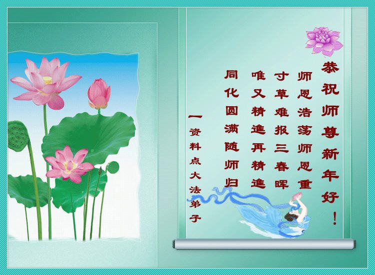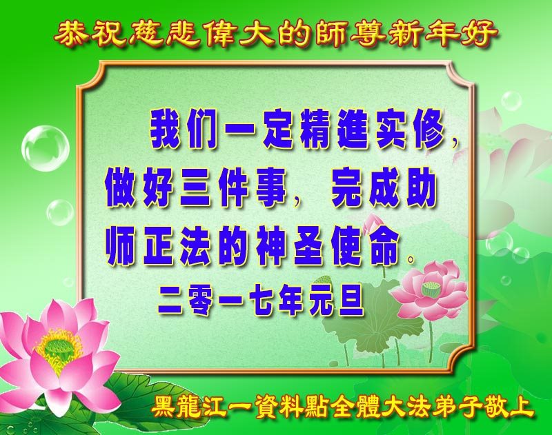 | 【明慧网二零一六年十二月三十日】(明慧网通讯员大陆报道)“这个家庭资料点平稳运作了十三年,弟子修炼中的每一步心性的提高都渗透着师尊的心血”,一位六十三岁的吉林市大法弟子在给师父的新年贺词中这样写到。 一九九二年五月,法轮大法由李洪志先生从长春传出,法轮大法的书籍在社会公开发行,有缘人可以在书店、书摊买到大法书,走入修炼。中共迫害法轮功后,各地的自费自发的家庭资料点就承载着印刷大法资料、救度众生的责任;同时大量印刷各类真相资料,向民众澄清大法真相,揭穿中共媒体的谎言。 “斗室虽寒身心暖,恩师呵护法中莲。元旦钟声醒世人,大法开创新纪元。”2017年新年,来自中国大陆各地的资料点的法轮功学员们向伟大的师尊致以真挚的节日问候! 长春一家庭资料点大法弟子恭贺师尊新年快乐!贺新年 谢师恩 又是一年转瞬过,回首修去几多执。 感恩师尊慈悲度,红尘梦醒解迷途。 弟子精進心坚定,了愿心正正念增。 不负师恩救众生,随师圆满登归程。 辽宁鞍山一资料点全体大法弟子恭祝师尊新年快乐!辽宁鞍山一资料点全体大法弟子恭祝师尊新年快乐!新的一年即将来临,恭祝师父在新的一年里身体健康、万事如意,弟子们一定精進实修,兑现来世的誓约,做好救人的三件事,不辱来世的使命。 吉林市一资料点大法弟子恭祝伟大的师尊新年好!师尊新年好!师尊您辛苦了!这是我第一次自己做敬献师尊。一直想自己亲手做,我什么都不会,是师尊看到我有这个愿望帮我做好的,过程中太神奇了! 在师尊的慈悲看护下,我这个家庭资料点平稳运作了十三年。弟子修炼中的每一步心性的提高都渗透着师尊的心血和承受,弟子无以为报,只有精進再精進,珍惜这万古不遇的修炼机缘。珍惜自己走过的路,在新的一年里,谨记师尊的教诲,多学法、静心学法,向内找实修自己不懈怠,以修炼如初的状态更加精進的做好三件事,用正念正行来回报师尊给予的所有,不辜负师尊的慈悲苦度,兑现史前誓约,圆满随师尊归。 吉林市六十三岁的弟子跪拜合十敬上! 河北承德资料点大法弟子恭祝伟大的师尊新年快乐!河北承德资料点大法弟子恭祝伟大的师尊新年快乐!感恩无尽言,唯有精進报师恩。 长春一资料点大法弟子恭祝师尊新年快乐!辽宁省抚顺市资料点大法弟子恭祝师尊新年快乐!师父新年好!师尊辛苦了!我们资料点的大法弟子想念师父!拜谢师恩! 重庆市潼南区一朵小花大法弟子恭祝慈悲伟大的师父新年快乐!信阳一个资料点大法弟子恭贺师父新年好!黑龙江鸡西市资料点大法弟子恭祝师父新年好!黑龙江省龙江县夫妻资料点大法弟子恭祝师尊元旦快乐!师尊您辛苦了!在新年到来之际,我们在这里恭祝师尊元旦快乐! 敬请师尊放心,我们在新的一年里,做好自己应该做的事,跟上正法進程。 黑龙江省龙江县夫妻资料点大法弟子 吉林省临江市一家庭资料点大法弟子恭祝慈悲伟大的师尊元旦快乐!吉林省长春市一家庭资料点大法弟子恭祝师父新年好!大法弟子在师父正法洪势的加持下,迎来了2017年元旦。在这新的一年中,回归的路程越来越近,我们一定要更加做好三件事,在修好自己同化大法的基点上多救世人,兑现自己的史前大愿,回归生我们的天国世界,不辜负师父的苦心救度! 上海三人讲真相小组大法弟子恭祝师尊新年快乐!慈悲伟大的师尊您好!二零一六年在师尊的慈悲呵护下。我们又走过了一年的正法修炼之路。值此二零一七年新年到来之际,请师尊接受弟子们以最虔诚、最真挚的感恩之心恭贺师尊元旦快乐! 在新的一年里,弟子们一定谨记您的教诲,紧跟正法進程,精進实修,努力做好三件事,放下一切人心与观念,全盘否定旧势力的安排。珍惜这转瞬即逝的历史机缘,履行正法时期大法弟子的伟大责任,兑现自己下世前的神圣誓约。努力做到密切配合,多救人、快救人,不辜负众生的殷切期盼,满载众生随师还!感恩师尊!叩拜师尊! 胜利油田资料点全体大法弟子恭祝慈悲伟大的师尊新年快乐!新年即将来临,弟子非常想念恩师,师父,您辛苦了!在正法進入尾声,无量大穹在正法中重获新生的时候,在邪恶即将被灭尽的时刻,我们一定谨遵师父教诲,扎扎实实做好三件事,救度更多的众生,以回报师尊的佛恩浩荡!兑现史前誓约。 山东省东营市资料点大法弟子恭祝师尊新年快乐!师尊辛苦了!河北石家庄新华家庭资料点老年大法弟子恭祝慈悲伟大的师尊快乐!值此西历2017年元旦到来之际,恭祝慈悲伟大的师尊快乐! 师尊您辛苦了! 河北石家庄新华家庭资料点老年夫妻大法弟子跪拜 山西忻州一资料点大法弟子恭祝师尊新年快乐!四川内江一资料点大法弟子恭祝师尊元旦节快乐!请慈悲伟大的师尊放心,我们一定修好自己,做好三件事,多救众生。 天津市宁河区资料点大法弟子恭祝师尊新年快乐!广州市一资料点大法弟子恭祝师尊新年好!感恩师尊造就了弟子的生命,又成就了弟子未来的一切。师恩浩荡语难诉。惟精進,修炼如初。 河北涿州市一资料点大法弟子恭祝师尊新年快乐!恭祝师尊新年快乐! 斗室虽寒身心暖 恩师呵护法中莲 真相台历放异彩 世人喜得谢师恩 元旦钟声醒世人 大法开创新纪元 众生醒悟明真愿 亿万法徒随师还 苍宇众生谢洪恩 涿州市一资料点大法弟子敬上 黑龙江一资料点大法弟子恭祝师父新年好!