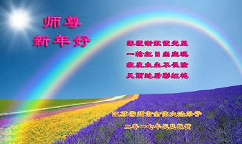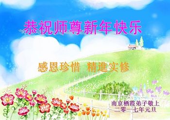 慈悲的师父新年好!感恩您慈悲的救度!在新的一年里,我们将继续努力实修,做好三件事,救度世人。 江苏省南京栖霞大法弟子恭祝师尊新年快乐!