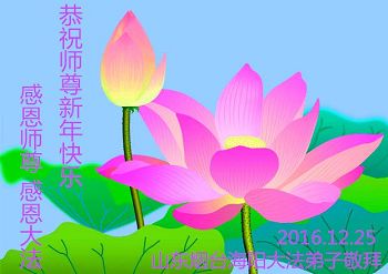 2016年接近尾声,在迎来2017年的到来之时,向师父问好,我们夫妻同修恭祝就师父新年快乐! 敬拜师尊 山东省烟台市海阳市一乡村夫妻同修 山东省烟台市栖霞市某乡镇一夫妻同修恭祝慈悲伟大的师父新年快乐!
