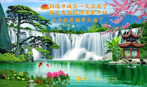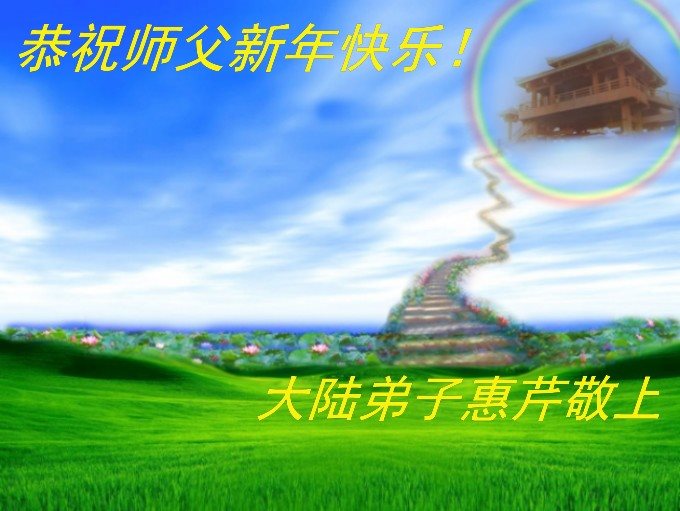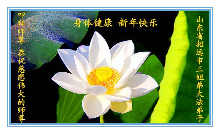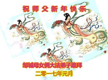 师父过年好!2017年到了,弟子在大陆吉林遥拜师尊新年好!在这正法的最后时刻,师尊以巨大的承受和付出给弟子延续了做好三件事和众生得救的机会。我们一定珍惜这修炼机缘,兑现大法弟子救度众生的誓约。理智、清醒的走好正法修炼路,听师父话,向内找,做师尊的合格弟子!谢谢师尊救度之恩!跪拜师尊过年好! 山东邹城母女俩大法弟子恭祝师父新年快乐!