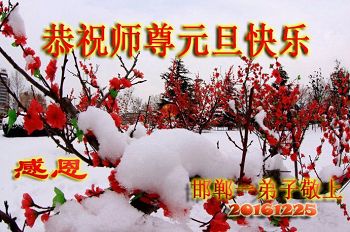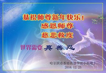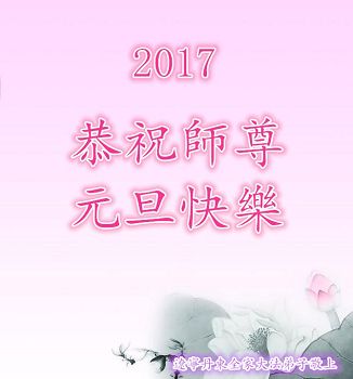 马上就到2017年元旦了,我们学法小组弟子向慈悲伟大的师父问好!听师父的话,修好自己,多救人,走好以后的路。谢谢师父慈悲苦度 辽宁省营口一家大法弟子恭祝慈悲伟大的师尊新年好!