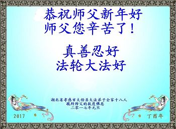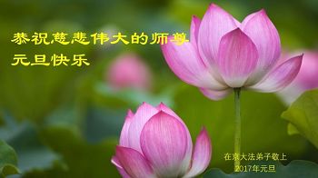 慈悲的师父新年好! 感恩师父,却无以回报。每每佳节来临,制作写上贺词,这时候是感到无比的幸福和荣耀!我们能当上正法时期的大法弟子,比起芸芸众生,该是多么的幸运!我们唯有精進,修好自己,才不负师恩。 教育系统的弟子们一定精進、再精進。弟子们恭祝师父新年好! 跪拜 合十 2016年12月26日敬上