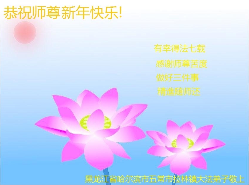 千言万语难表弟子心中的感恩,感恩慈悲伟大的师尊!在新的一年里,弟子一定珍惜师尊用巨大承受延续来的时间,做好三件事,无条件同化大法,救度更多众生。 黑龙江省哈尔滨市五常市拉林镇大法弟子恭祝师尊新年快乐!