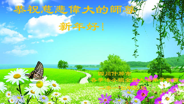 正值新年来临之际,弟子们恭祝慈悲伟大的师父新年快乐!师父您辛苦了! 对于师父的无量慈悲苦度,弟子们用尽人类的语言永远也无法表达,我们虽然是新得法的学员,但在最后师父用巨大的承受延续来的时间里,我们一定听师父的话,学好法,向内找,修好自己,做好三件事,多救度世人,完成自己的历史一使命,圆满随师还。 湖南省长沙市某一学法小组 湖北武汉江岸区二七全体大法弟子恭祝慈悲伟大的师父新年快乐!