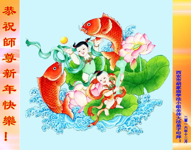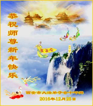 回想即将过去的2016年,弟子经历了许多,也暴露出自己太多的不足。从今日起,我要抓紧在人世间与正法同在的有限时间,多学法,紧跟正法進程,修去一切人心,尽可能修好自己,兑现誓约,多救人,不负师尊的慈悲救度! 西安大法弟子全家敬拜师父,恭祝师父新年快乐! 2016.12.27 陕西西安大法弟子恭祝伟大的师尊新年快乐!