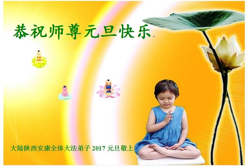 师尊新年好,师尊辛苦了!弟子们敬祝师尊2017元旦快乐!弟子们要永远追随师尊,努力做好三件事,跟师尊回家。 陕西省西安市大法弟子叩拜恩师 2016年12月25日 陕西安康全体大法弟子恭祝师尊2017元旦快乐!