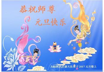 慈悲伟大的师尊:您好!元旦来临之际,祝愿师尊元旦快乐!弟子牢记师尊的教导,做好大法弟子的三件事,放下太多,太强的执着,走好以后修炼的路,让师尊放心。 陕西西安南郊电子城全体大法弟子 陕西西安高陵泾河工业园大法弟子恭祝师尊新年快乐!