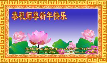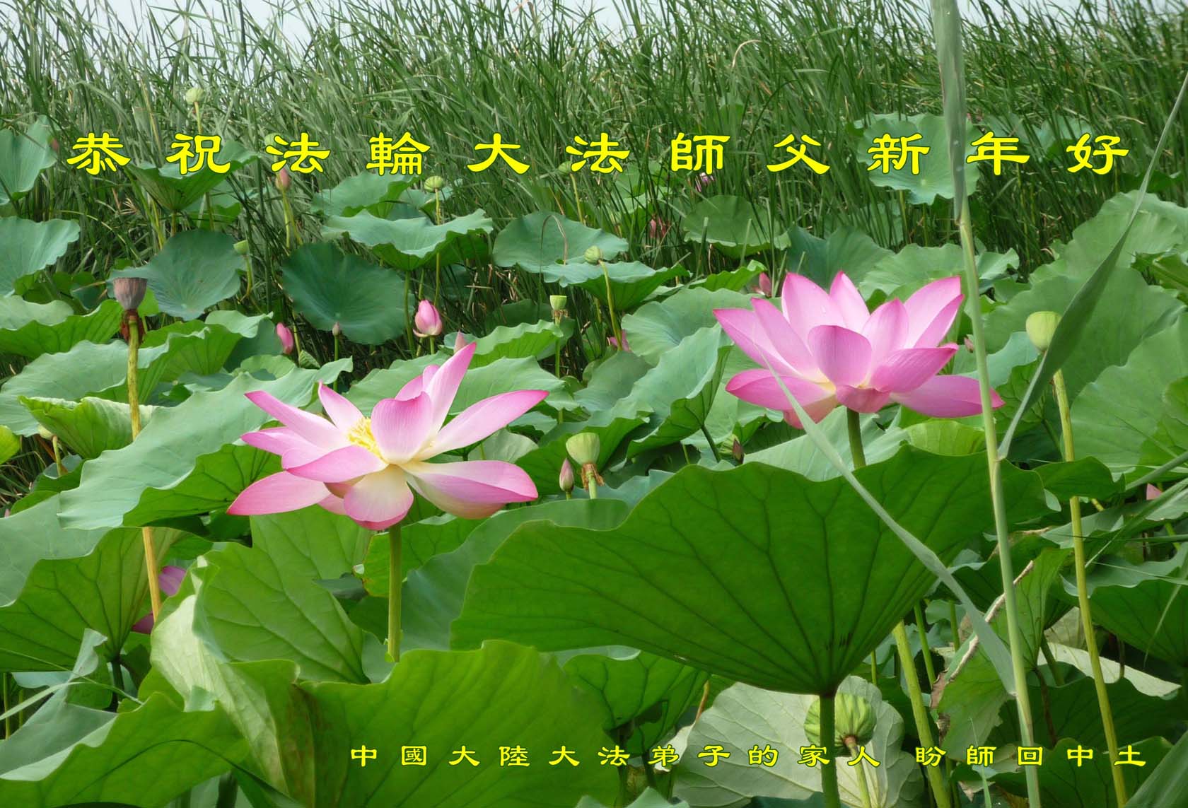 中国大陆大法弟子的家人恭祝法轮大法师父新年好! 感恩大法师父的慈悲救度,盼大法师父早回中土! 中国大陆大法弟子恭祝师尊新年好