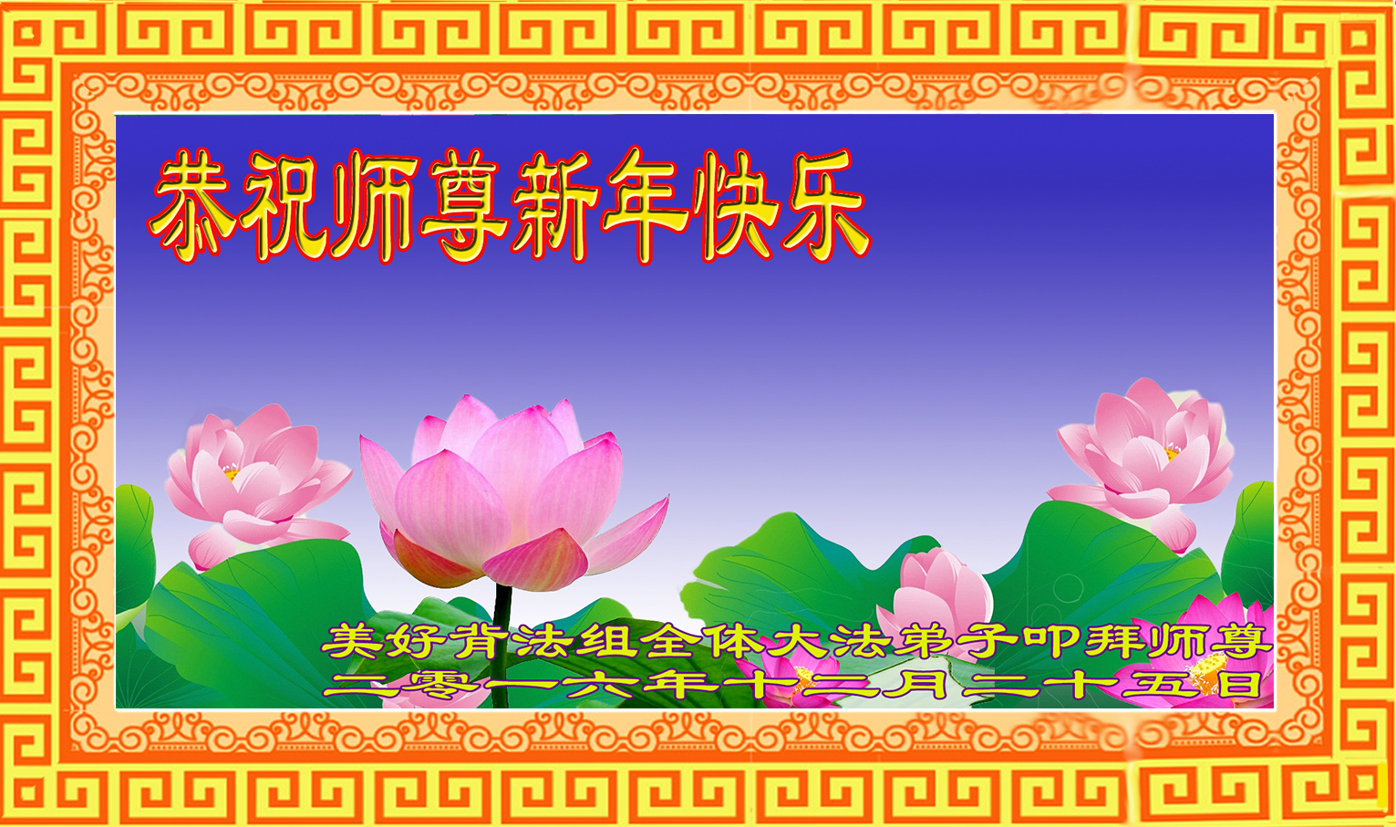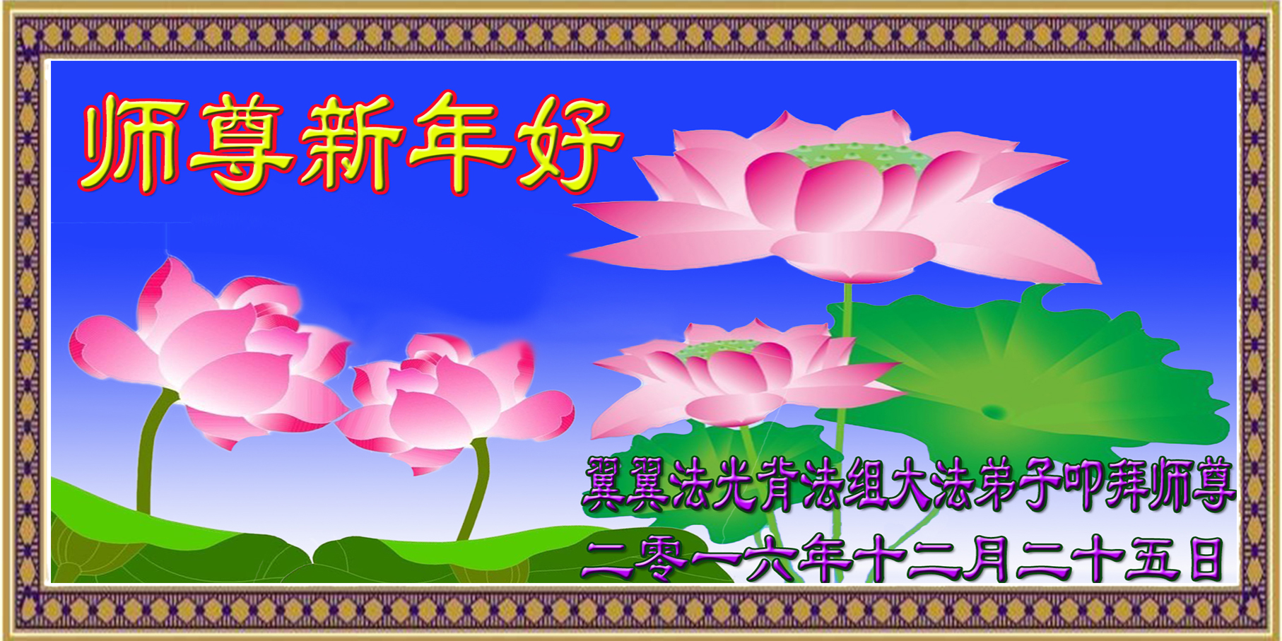 师父您好:千言万语表达不尽弟子对师父的感恩,弟子唯有听师父的话,做好三件事,精進实修以报师恩。 六位大法弟子恭祝师尊新年快乐! 2016/12/29 吉林省长春市二道区一学法小组恭祝慈悲伟大的师尊新年快乐!